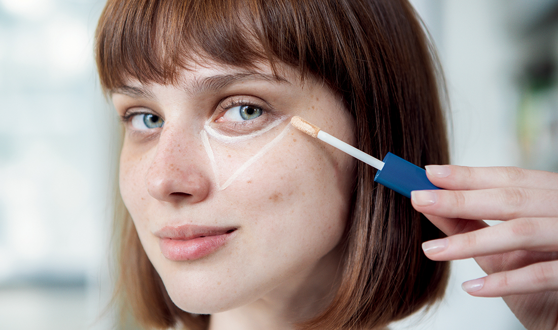 - Aplikátorom pod očami vytvorte obrátený trojuholník