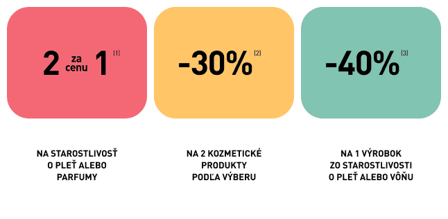 (3) Zľavy a ponuky sa nekumulujú. Ponuka sa nevzťahuje na balíčky, darčekové šeky a miniatúry produktov. Ponuka platí len na nákup produktov z kategórie Starostlivosť o pleť a Parfumy.