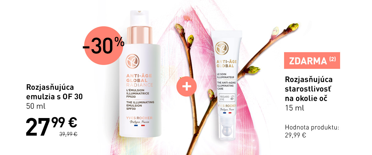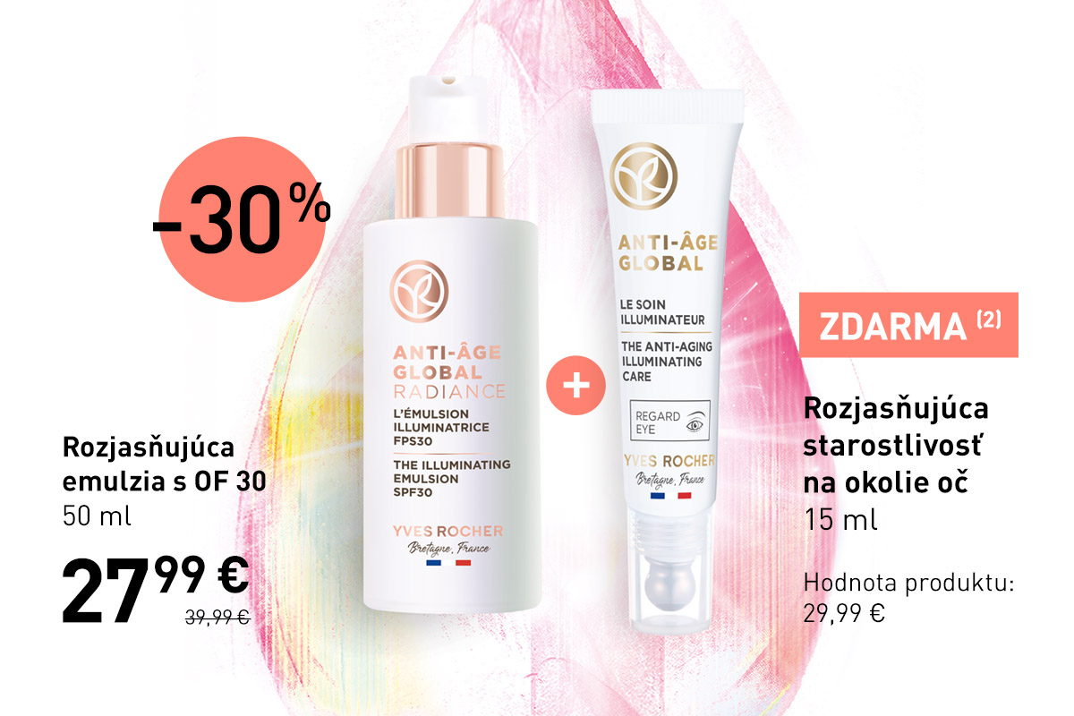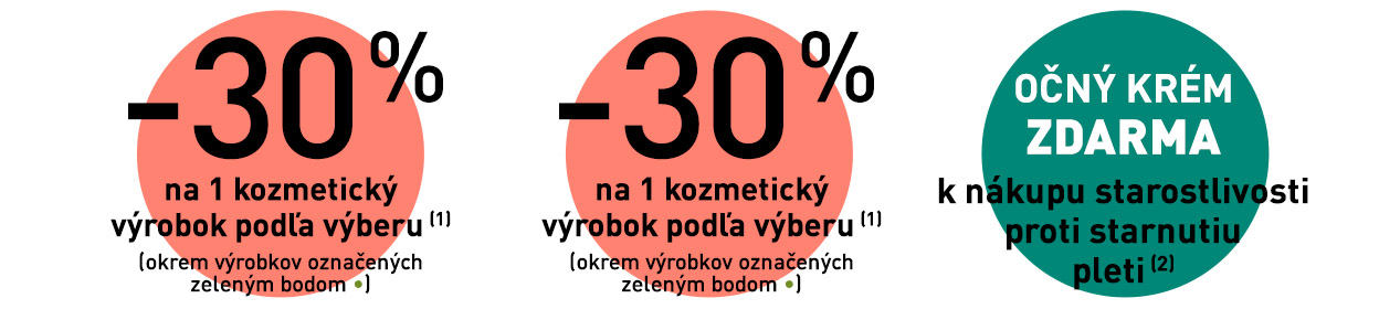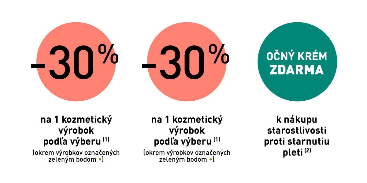 (2) K nákupu starostlivosti proti starnutiu pleti získate starostlivosť na okolie očí z rovnakého radu zdarma. Ponuka sa vzťahuje len na nákup dennej, nočnej starostlivosti o pleť, séra alebo starostlivosti na okolie očí.