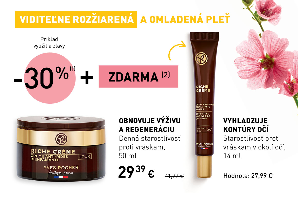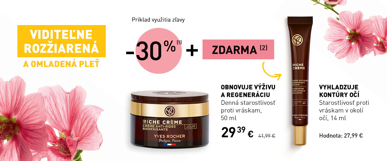 (2) K nákupu starostlivosti proti starnutiu pleti získate jednu starostlivosť na okolie očí z rovnakého radu zdarma. Ponuka sa vzťahuje len na nákup dennej a nočnej starostlivosti, séra alebo starostlivosti o okolie očí z radu proti starnutiu pleti. Ponuka sa nevzťahuje na odličovače, micelárne a čistiace gély, krémy na ruky, balzamy na pery a telové balzamy. Ponuka platí do vydania zásob. Ponuka nie je kumulovateľná (jeden očný krém na jednu objednávku) a platí na produkty z radu Riche Créme, Anti-Ge Global, Elixir Botanique, Lifting Végétal a Filler Végétal.
