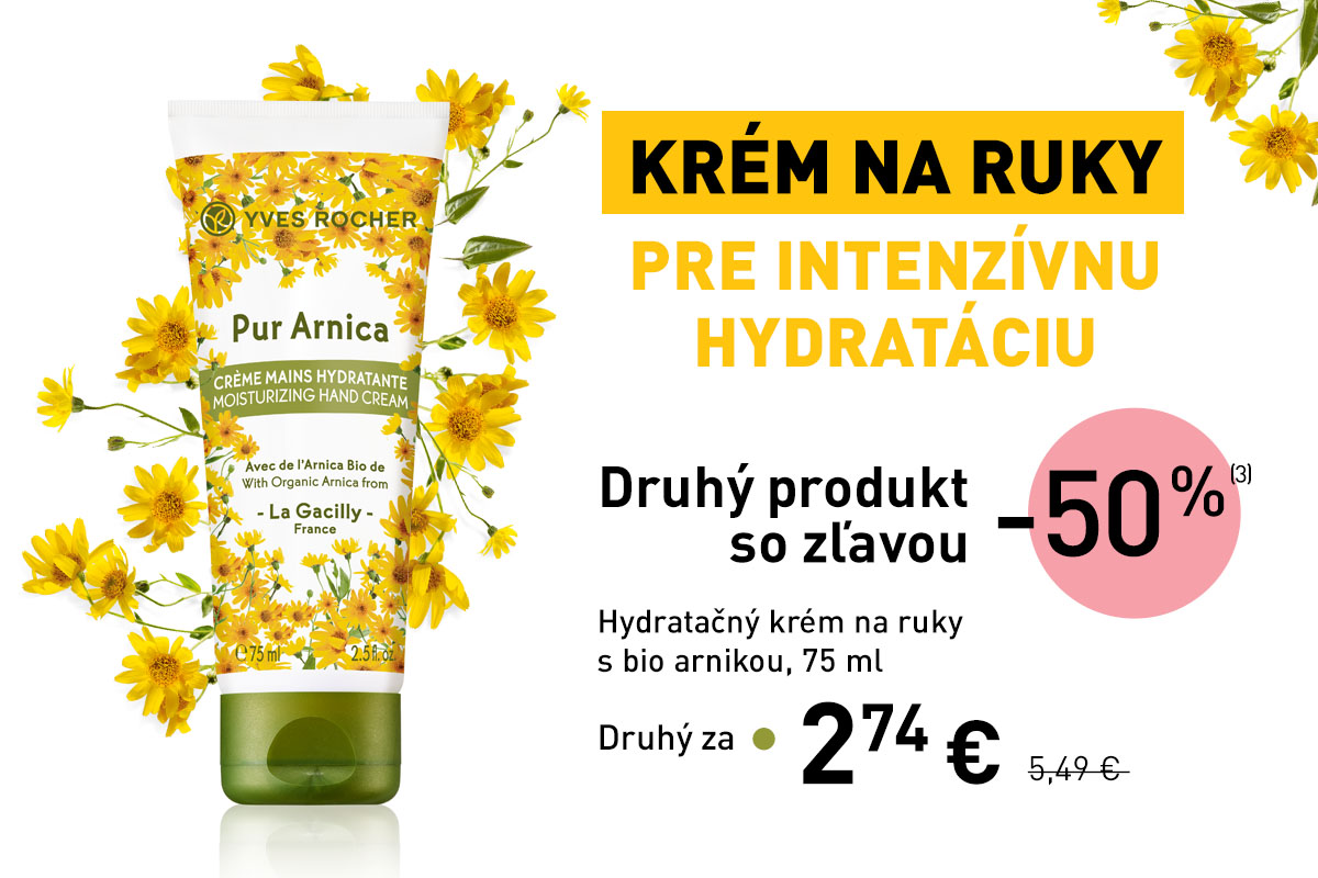 (3) Zľavy a ponuky sa nekumulujú. Druhý Hydratačný krém na ruky s bio arnikou so zľavou 50%. Darčeky budú vydané len raz. Všetky zľavy sa vypočítavajú zo základných cien pred zľavou odporučených v SR od 30.1.2023. Ponuka platí do 31. 3. 2023. Vyhradzujeme si právo ponuku kedykoľvek zmeniť alebo zastaviť v prípade, že dôjdu skladové zásoby.