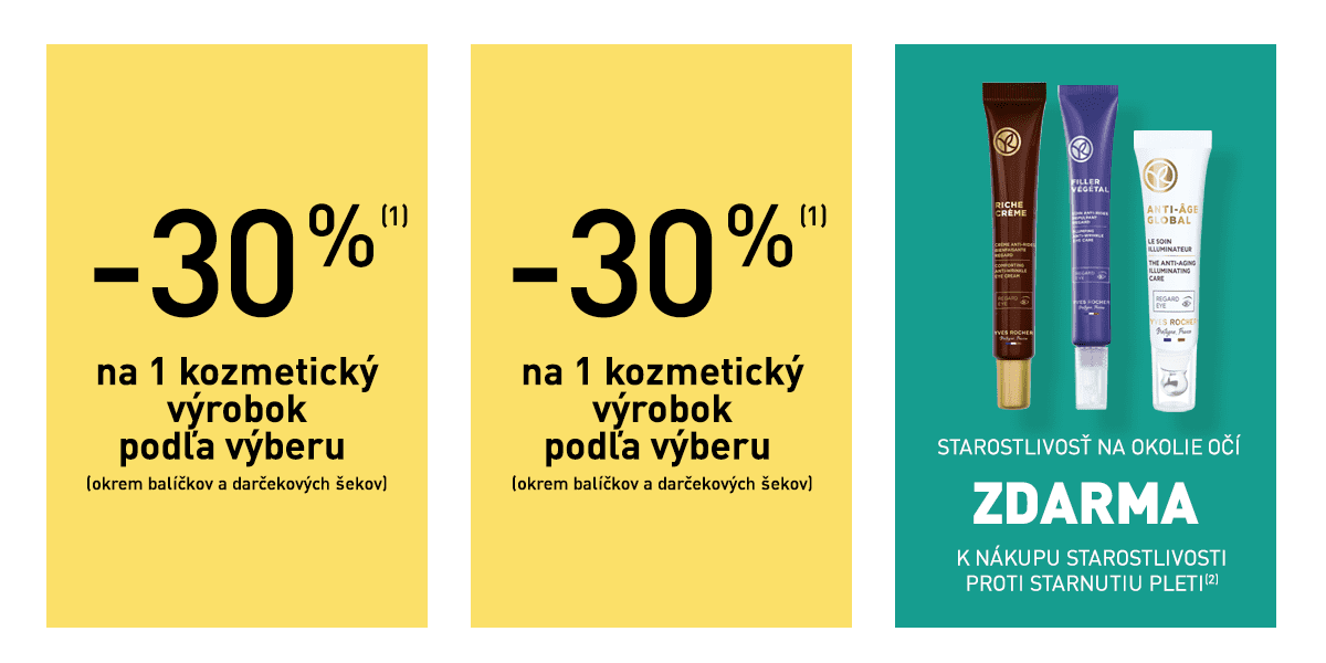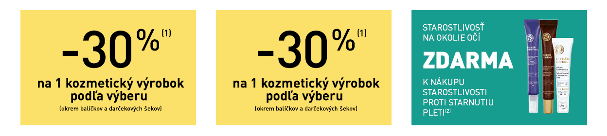 (1) Zľavy a ponuky sa nekumulujú. Zľava platí na 1 kozmetický výrobok podľa výberu. Zľava sa nevzťahuje na balíčky a darčekové šeky.