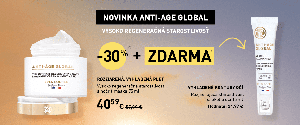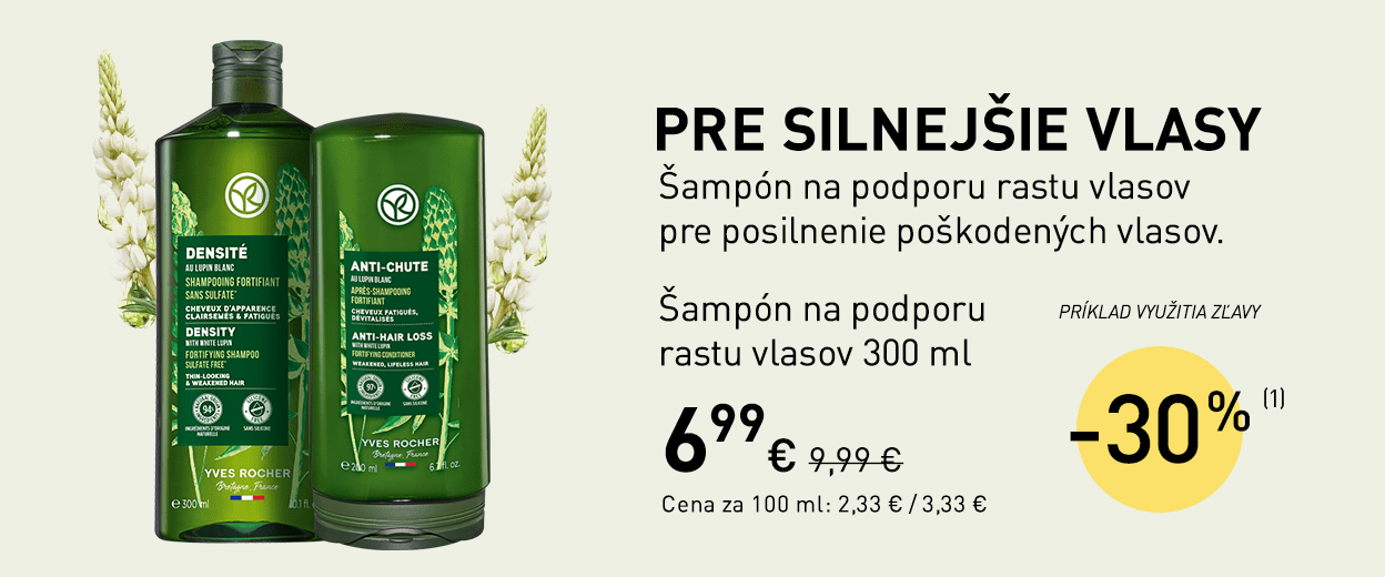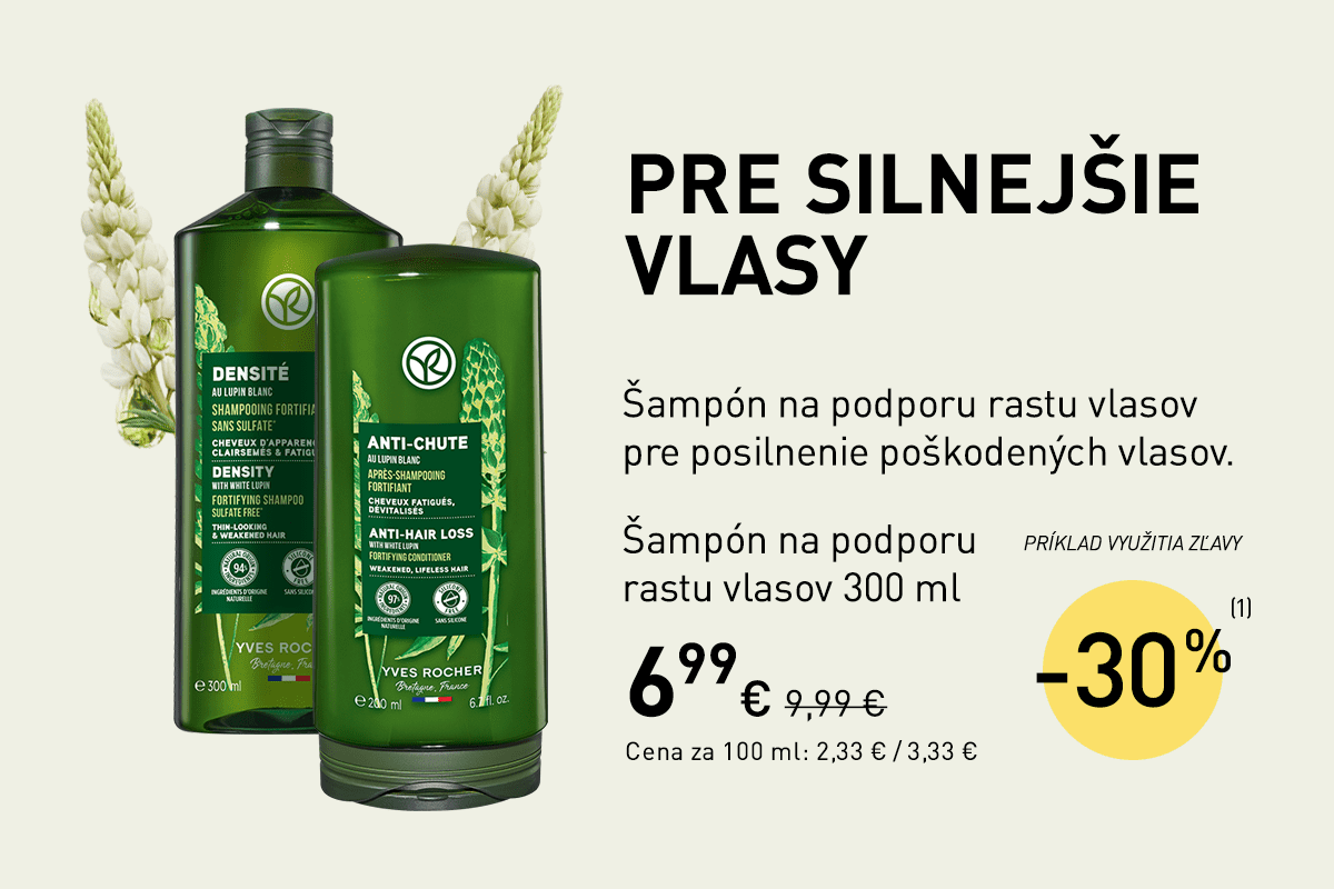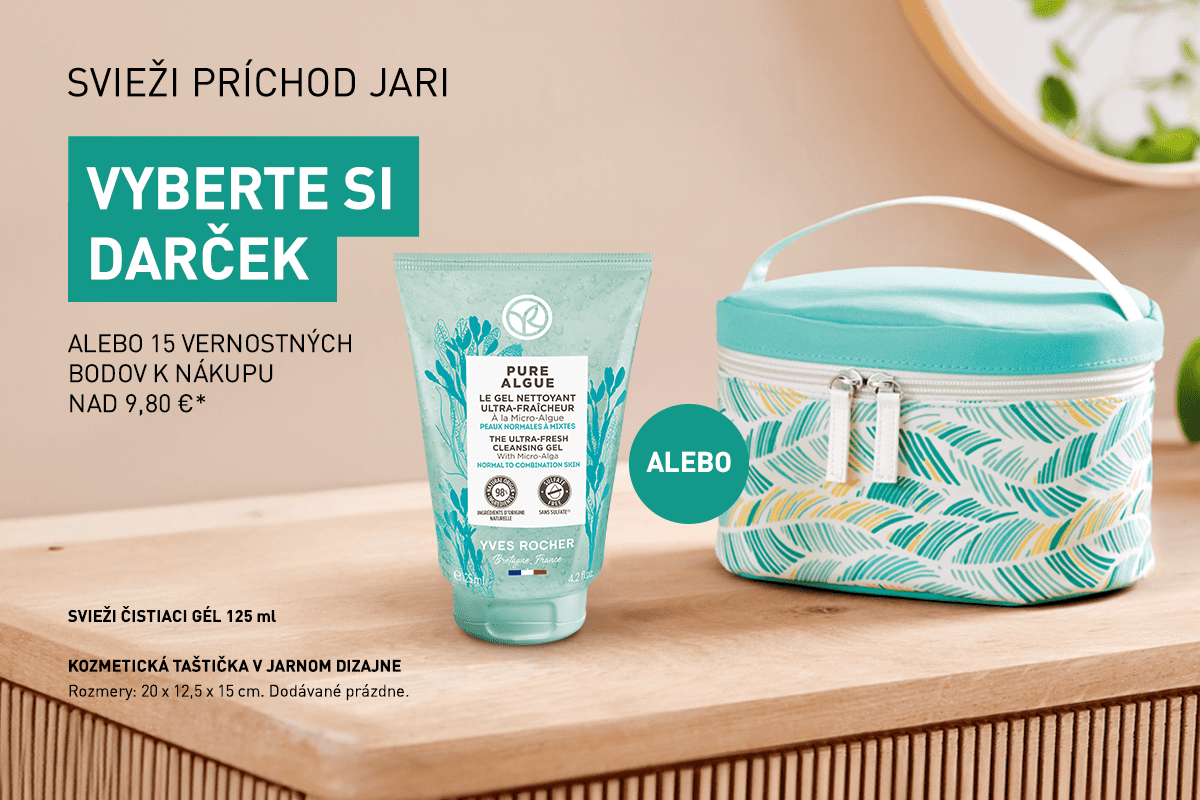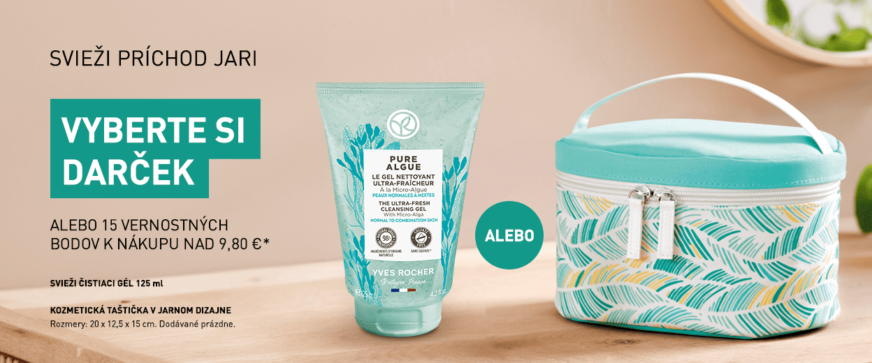 *Zľavy a ponuky sa nekumulujú. Jeden Svieži čistiaci gél, 125 ml alebo jedna kozmetická taštička alebo 15 vernostných bodov k nákupu nad 9,80 € na zákazníka. Ponuka platí do vydania zásob na základe predloženia letáka a Vernostnej karty Yves Rocher počas nákupu. Zmena darčeka vyhradená. Ponuky z letáka je možné uplatniť len jedenkrát. Leták nie je možné uplatniť po platnosti. Všetky zľavy sa vypočítavajú zo základných cien pred zľavou odporučených v SR od 31.1.2024. Ponuka je platná do 31. 3. 2024.