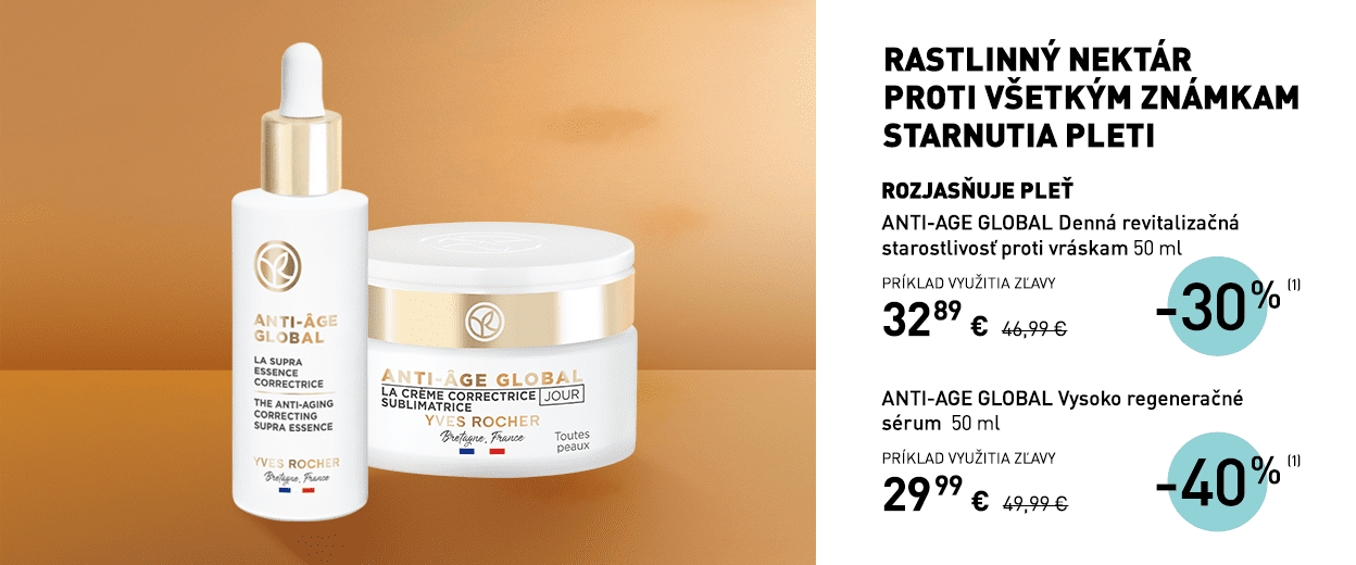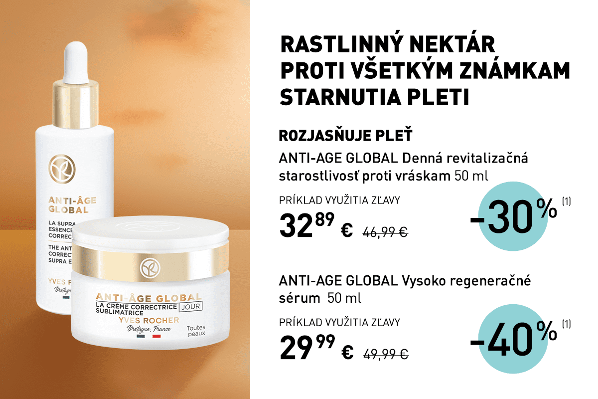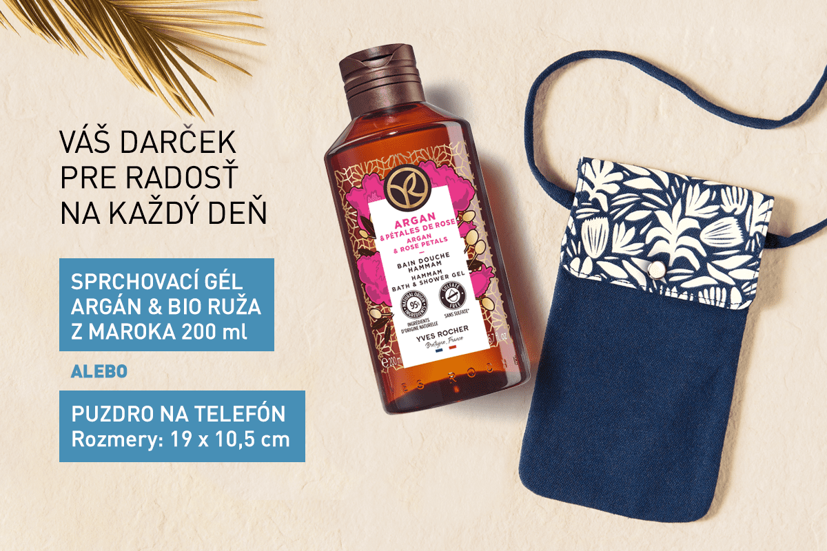 *Zľavy a ponuky sa nekumulujú. Jeden sprchovací gél Argán & bio ruža z Maroka alebo Puzdro na telefón alebo 15 vernostných bodov k nákupu nad 4,80 € na zákazníka. Ponuka platí do vydania zásob na základe predloženia tohto letáka a Vernostnej karty Yves Rocher počas nákupu. Zmena darčeka vyhradená. Darčeky budú vydané len raz. Všetky zľavy sa vypočítavajú zo základných cien pred zľavou odporučených v SR od 31.1.2024. Ponuka je platná do 31. 5. 2024.
