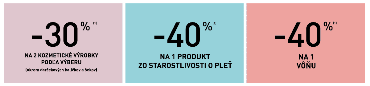 *Zľavy a ponuky sa nekumulujú. Jeden darček ako prekvapenie alebo 15 vernostných bodov k nákupu nad 15 € na zákazníka. Ponuka platí do vydania zásob. Zmena darčeka vyhradená. Všetky zľavy sa vypočítavajú zo základných cien pred zľavou odporučených v SR od 1. 1. 2024. Ponuka je platná do 30. 6. 2024.