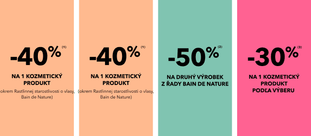(1) Zľava sa nevzťahuje na produkty z radu Bain de Nature, rastlinnej starostlivosti o vlasy, balíčky, darčekové šeky a miniatúry produktov.