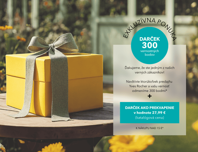 *Jeden darček ako prekvapenie a 300 vernostných bodov k nákupu nad 15 € na zákazníka. Ponuku 300 bodov navyše je možné získať po aktualizácii vašich osobných údajov vo vernostnom programe. Ponuka platí do vydania zásob. Zmena darčeka vyhradená. Darček bude vydaný len raz.