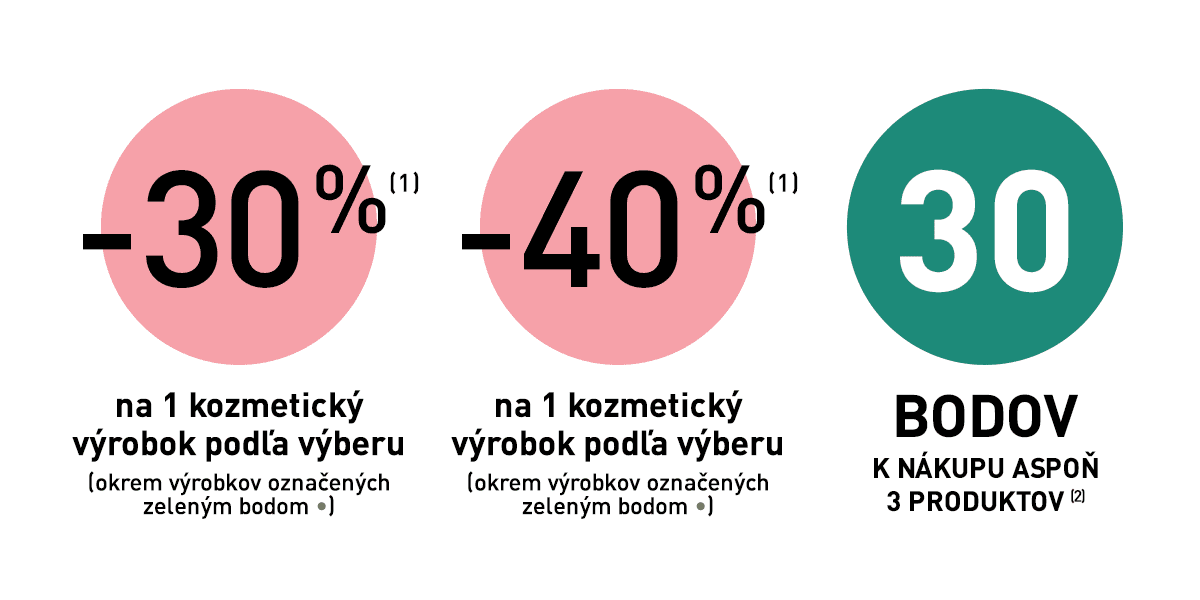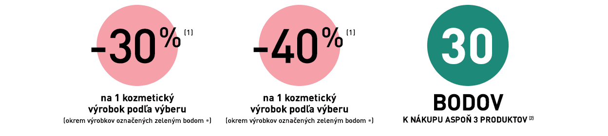 (2) Zľavy a ponuky sa nekumulujú. 30 vernostných bodov zdarma k nákupu aspoň 3 produktov je možné využiť len raz.