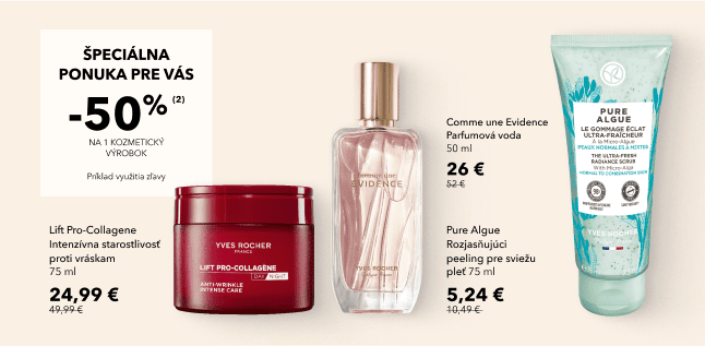 Darčeky budú vydané len raz. Zmena darčekov vyhradená. Všetky zľavy sa vypočítavajú zo základných cien pred zľavou odporučených v SR od 24.7.2024. Ponuky z letáka sa v internetovom obchode môžu líšiť. Ponuka platí v kamenných predajniach Yves Rocher v SR, na e-shope www.yves-rocher.sk alebo v mobilnej aplikácii do 31. 7. 2025.