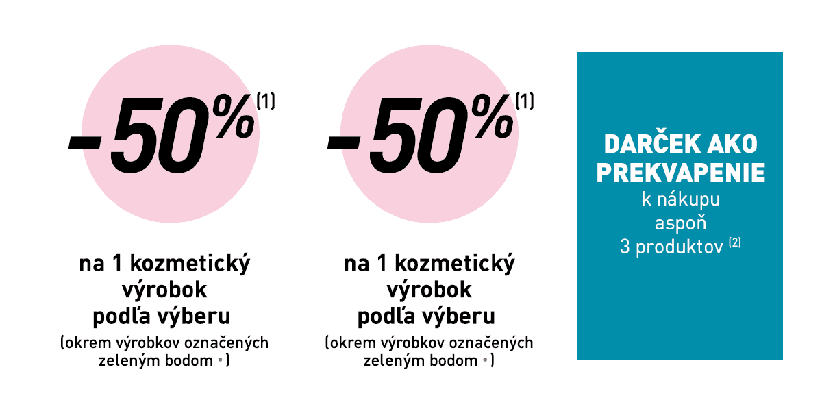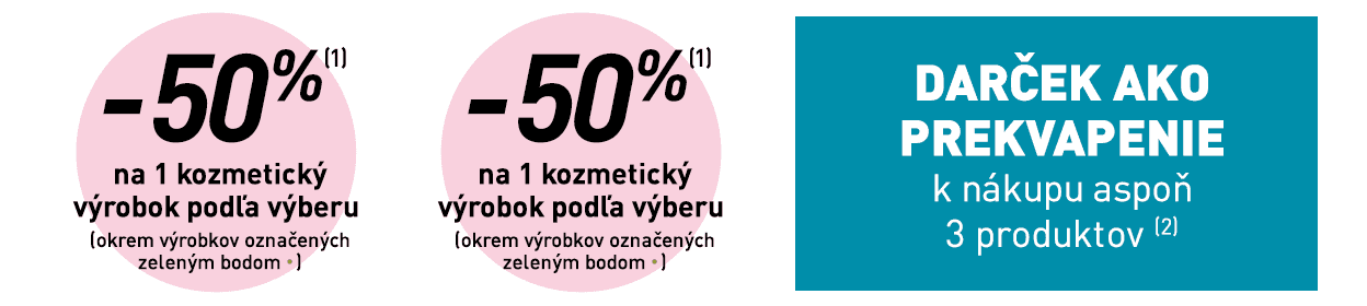 (2) Zľavy a ponuky sa nekumulujú. Jeden darček ako prekvapenie k nákupu aspoň 3 produktov. Darčeky budú vydané len raz. Všetky zľavy sa vypočítavajú zo základných cien pred zľavou odporučených v SR od 3.4.2023.