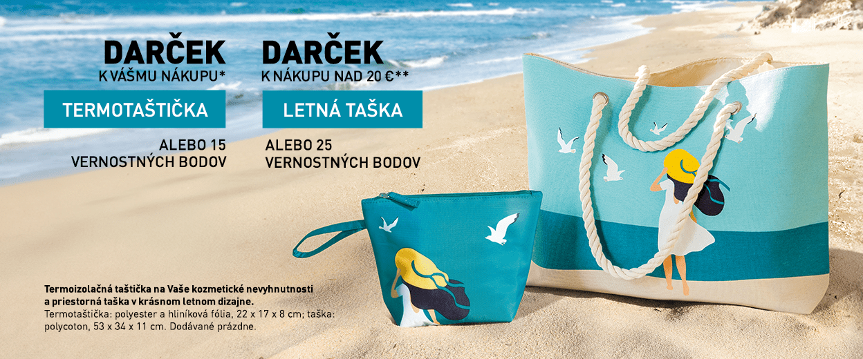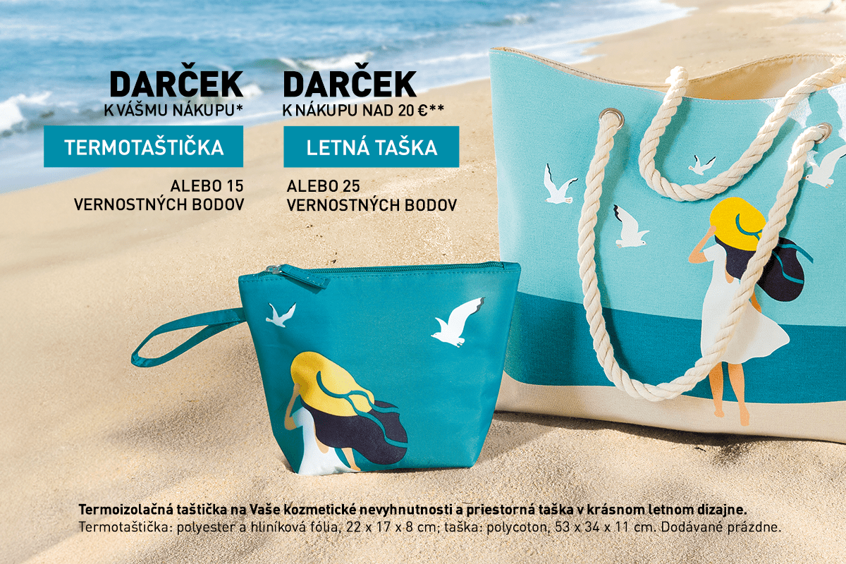 **Zľavy a ponuky sa nekumulujú. Jedná letná taška alebo 25 vernostných bodov k nákupu nad 20 € na zákazníka. Ponuka platí do vydania zásob. Zmena darčeka vyhradená.