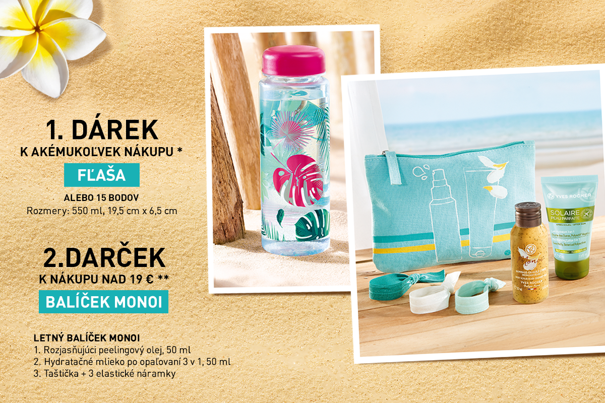 *Jedna fľaša alebo 15 vernostných bodov k nákupu nad 3,79 €. Jeden balíček MONOI alebo 25 vernostných bodov na zákazníka k nákupu nad 19 €. Ponuka platí do vydania zásob. Zmena darčeka vyhradená. Darček bude vydaný len raz. Newsletter nie je možné uplatniť po platnosti. Ponuka platí v kamennych predajniach a v internetovom obchode do 31.8.2021. Ponuku nie je možné kombinovať a kumulovať s inými akciami. Pred potvrdením objednávky si prosím skontrolujte, či sa zľava načítala. V opačnom prípade sa akčná ponuka neuplatnila. Keď využijete ponuku tohto mailingu, nie je možné vkladať darčeky z ponuky e-shopu. Na ponuku mailingu sa nedá uplatniť vernostná zľava.