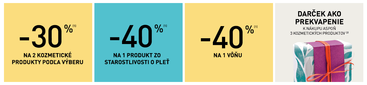 (1) Zľavy a ponuky sa nekumulujú. Ponuka sa nevzťahuje na balíčky a darčekové šeky.