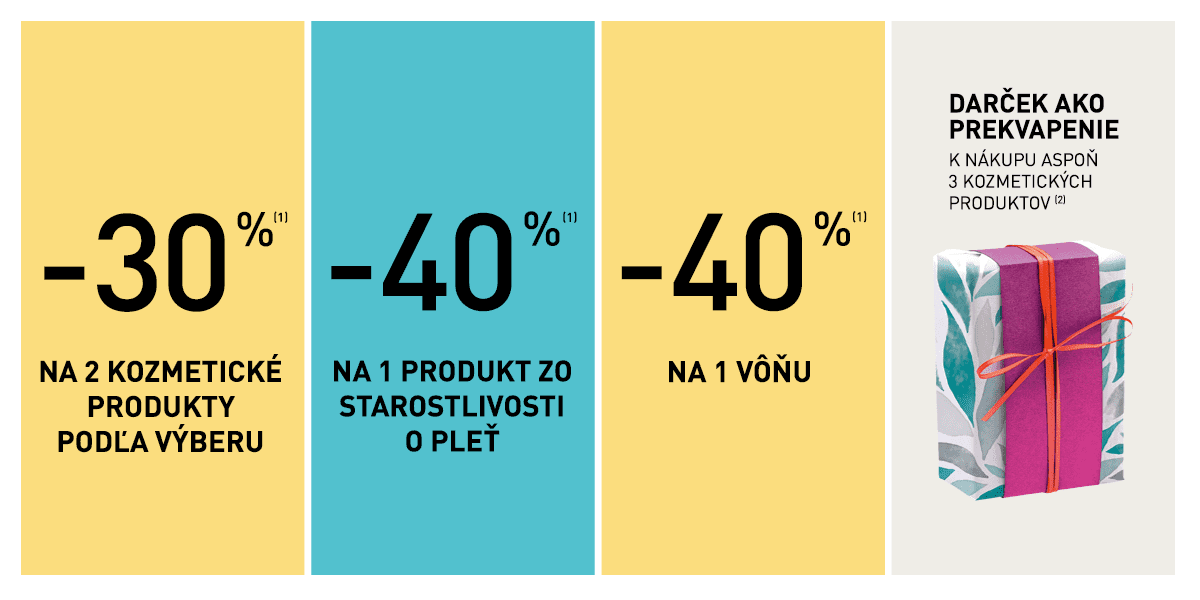 (2) Zľavy a ponuky sa nekumulujú. Jeden darček ako prekvapenie k nákupu aspoň 3 produktov.