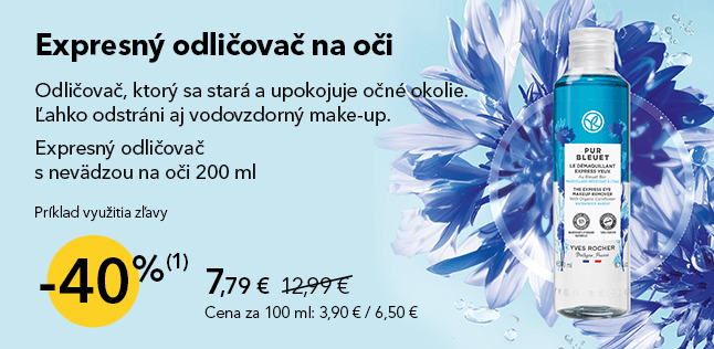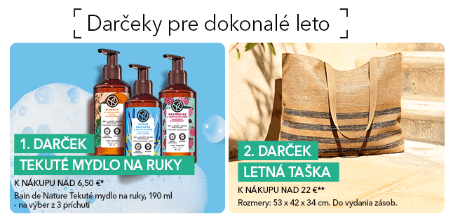 Darčeky budú vydané len raz. Zmena darčekov vyhradená. Všetky zľavy sa vypočítavajú zo základných cien pred zľavou odporučených v SR od 24.7.2024. Ponuky z letáka sa v internetovom obchode môžu líšiť. Ponuka platí v kamenných predajniach Yves Rocher v SR po predložení tohto letáka a v internetovej predajni www.yves-rocher.sk do 31. 8. 2025.