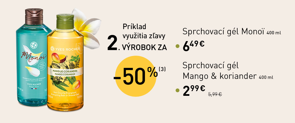 (3) Zľavy a ponuky sa nekumulujú. Ponuka sa vzťahuje na Sprchovacie gély 400 ml PLAISIRS NATURE (rôzne vône) a Sprchovací gél 400 ml MONOI. Zľava bude uplatnená na druhý produkt v nižšej alebo rovnakej hodnote.