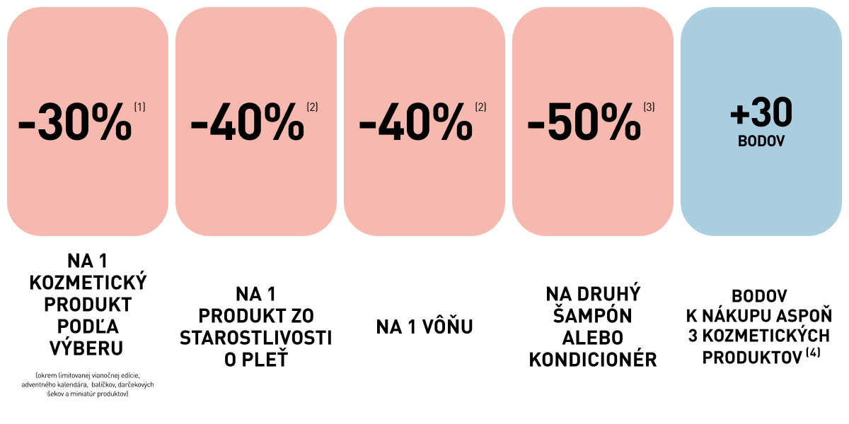 (4) Zľavy a ponuky sa nekumulujú. 30 vernostných bodov zdarma k nákupu aspoň 3 produktov je možné využiť len raz. Darčeky budú vydané len raz.