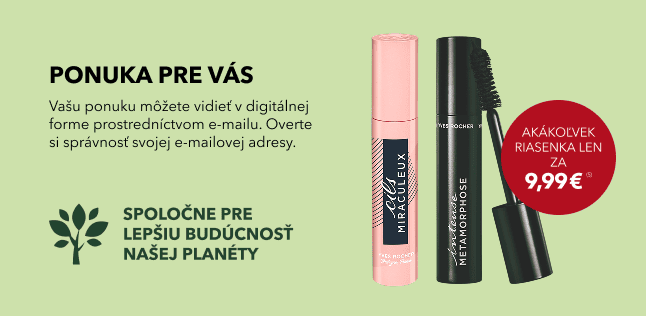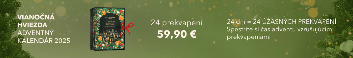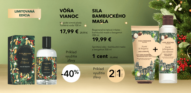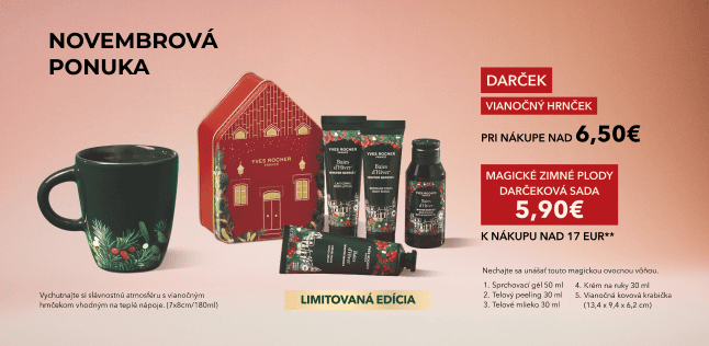 Vianočný hrnček za 0,01 EUR ako darček k nákupu nad 6,50 EUR. Darčeková sada za 5,90 EUR k nákupu nad 17 EUR. (1) Pri kúpe 1 ks kozmetického produktu za plnú cenu dostanete druhý produkt (s nižšou cenou) za 0,01 EUR. (2) Zľava 40 % na jeden kozmetický produkt podľa vášho výberu. (3) Zľava 40 % na jeden parfum podľa vášho výberu. (4) Informácie o ponuke „Joker“ a jej detailoch získate u našich kozmetických poradkýň v kamenných predajniach. (5) Jednu riasenku podľa vášho výberu si môžete zakúpiť za 9,99 EUR. Uvedené ponuky nie sú kombinovateľné s inými zľavami a nevzťahujú sa na darčekové sety, baliaci materiál, adventný kalendár a darčekové poukážky. Ponuky platia do vydania zásob na základe predloženia tohto letáka a vernostnej karty Yves Rocher počas nákupu. Darčeky budú vydané len raz. Zmena darčekov vyhradená. Ponuky z letáka je možné uplatniť len jedenkrát. Leták nie je možné uplatniť po platnosti uvedenej na prednej strane. Všetky zľavy sa vypočítavajú zo základných cien pred zľavou odporučených v SR od 24.7.2024. Tlačové chyby vyhradené. Ponuky z letáka sa v internetovom obchode môžu líšiť. Pre využitie ponuky tohto letáka v internetovom obchode použite unikátny kód.
