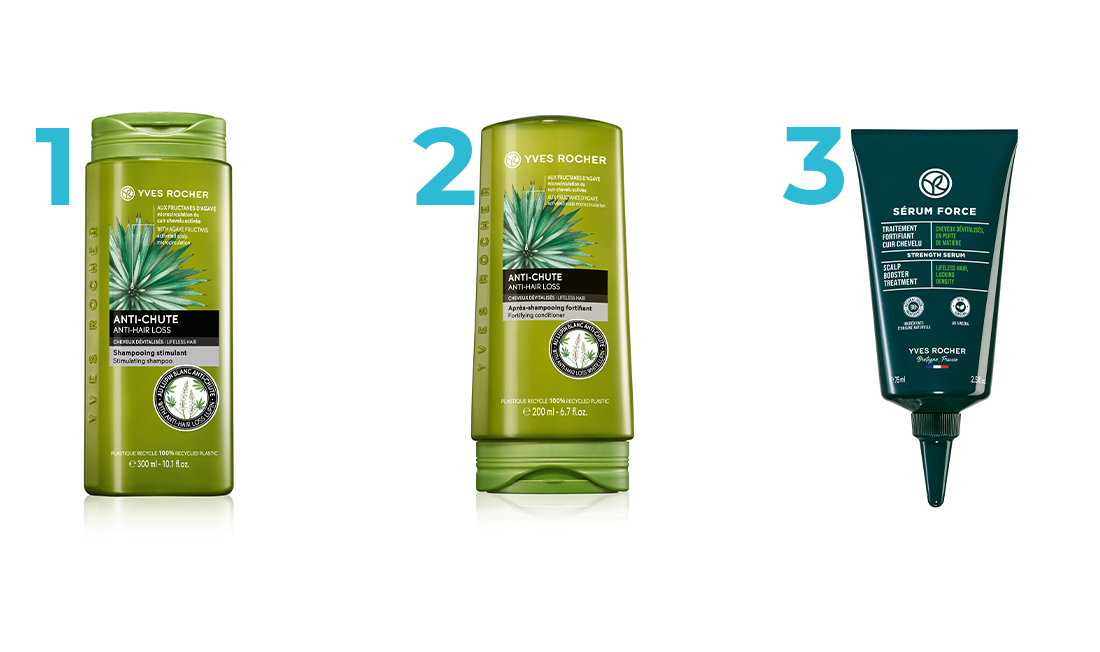 Krok 1: Vyberte si správny šampón. Krásne vlasy začínajú zdravou pokožkou hlavy. Posilňujúci šampón obsahuje fruktány z agávy, ktoré zdvojnásobujú mikrocirkuláciu a vyživujú korienky (1), a biely vlčí bôb, ktorý spomaľuje mechanizmy vypadávania vlasov a stimuluje rast vlasov (1). Vďaka receptúre bez obsahu sulfátov (2) spomaľuje vypadávanie vlasov (3) a zanecháva ich silnejšie a zdravšie. Použitie: Naneste na mokré vlasy. 2 minúty vmasírujte do pokožky hlavy krúživými pohybmi. Opláchnite. V prípade kontaktu s očami dôkladne vypláchnite.