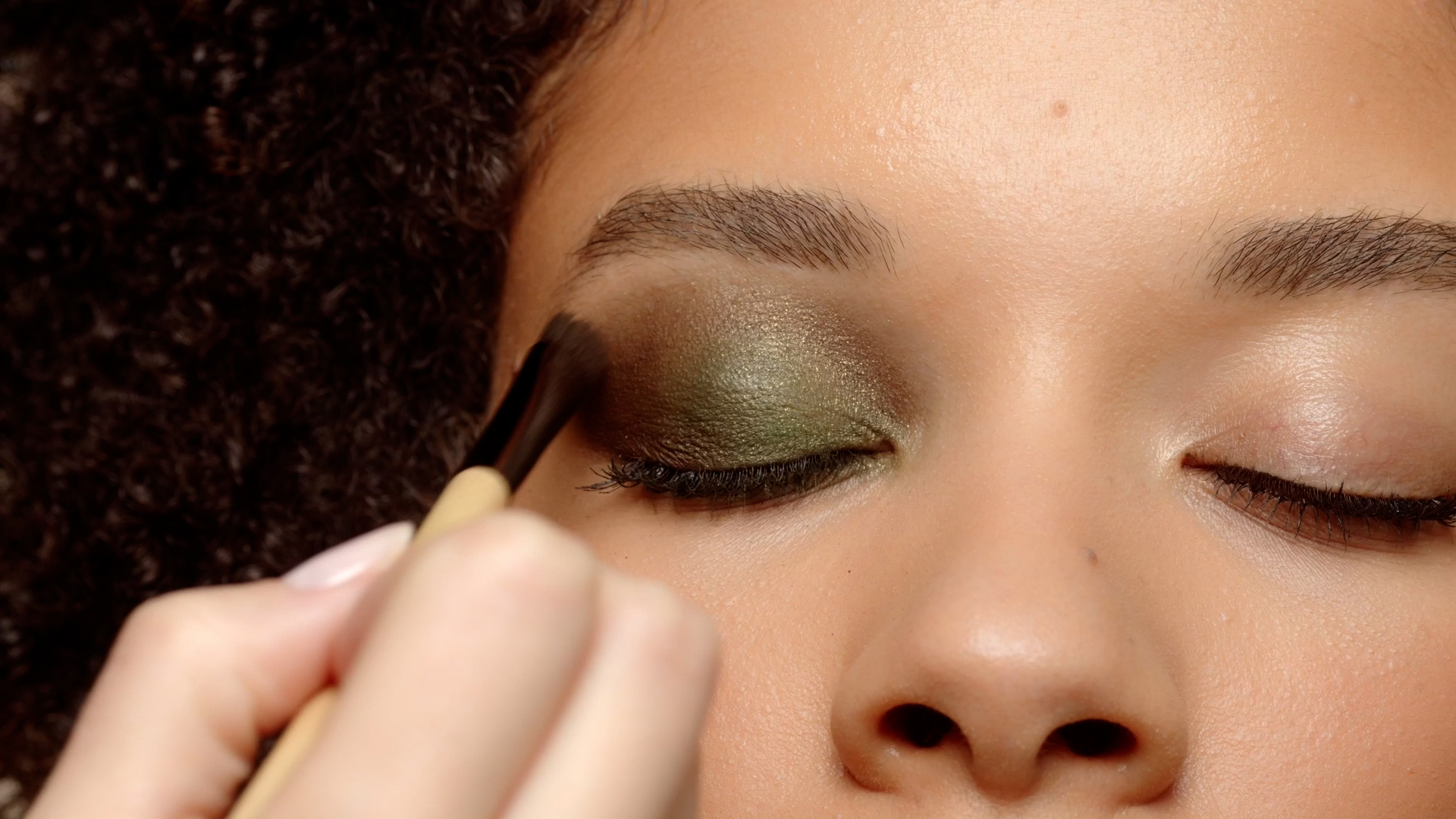 Kaki očné tiene naneste na celé viečko a pozdĺž dolnej línie rias a potom ich rozotrite štetcom.