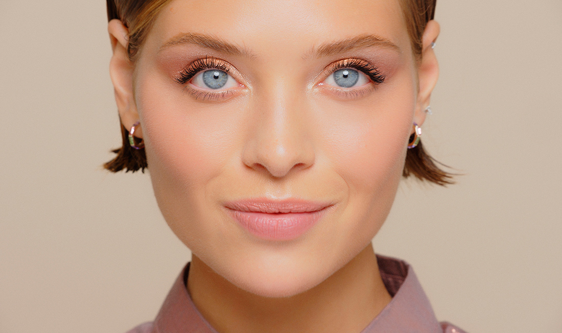 Následne naneste svetlejší odtieň pod nadočnicový oblúk, aby sa zotreli prechody predchádzajúceho odtieňa. My sme vybrali odtieň Etincelle z rovnakej palety. Nakoniec aplikujte ešte svetlejší odtieň do vnútorného kútika oka a na nadočnicový oblúk. Modelka je nalíčená odtieňom Lotus z Palety očných tieňov pre zimné líčenie.